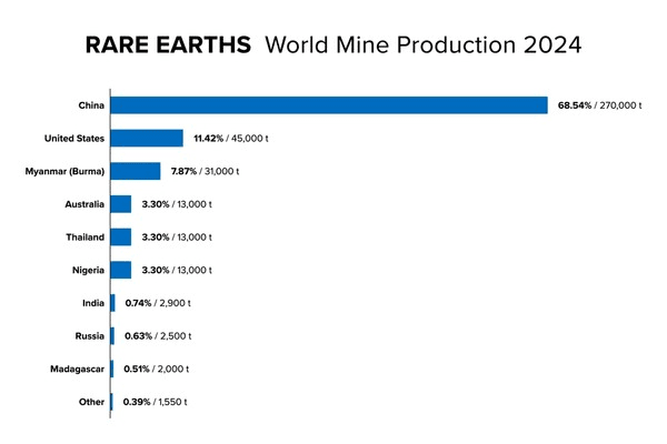 Las llamadas tierras raras son diecisiete elementos químicos no particularmente escasos en el mundo, pero que se encuentran en muy bajas concentraciones en general, lo que requiere gran pericia en su procesamiento y refinación. China produce entre el 60 y 70% de las tierras raras, elabora entre el 80 y el 90% y produce, lo que incluye ambas etapas, la casi totalidad de las llamadas tierras raras pesadas. Estos elementos son imprescindibles en las industrias militares, la energía nuclear y la alta tecnología pues son básicas para producir imanes, catalizadores, baterías y elementos para la metalurgia, entre otras aplicaciones.