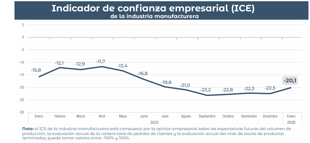 - El indicador de confianza empresarial, que surge del balance entre respuestas positivas y negativas para las tres preguntas, dio para enero un valor de -20,1. Si bien es una mejora con respecto a los cinco meses anteriores, se mantiene dentro por debajo de los resultados para la primera mitad de 2025.