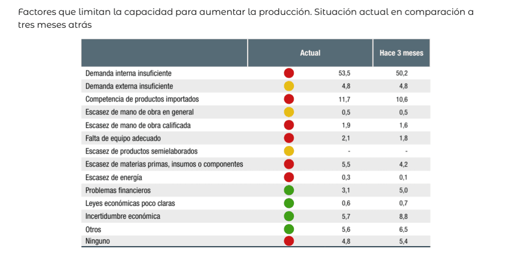 - La demanda interna insuficiente predomina como el principal factor que limita el incremento de la producción. Lo interesante es que su participación entre los motivos considerados tuvo tres puntos de incremento en comparación con tres meses atrás.