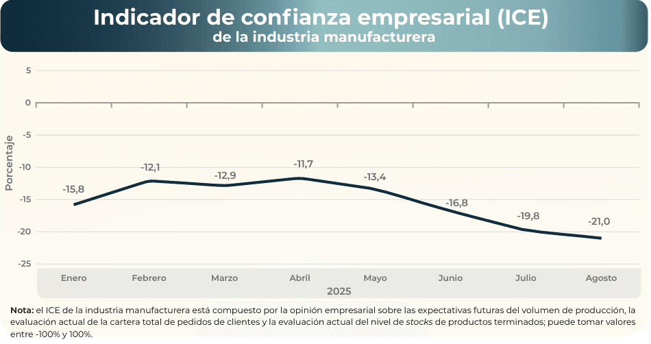 El indicador de confianza de la industria manufacturera considera las variables de producción y cartera de pedidos. El de supermercados y autoservicios mayoristas toma en cuenta la situación comercial actual y la futura. En las dos mediciones se toman en cuenta los stocks, y se elabora un balance para cada componente que excluye las respuestas neutrales.