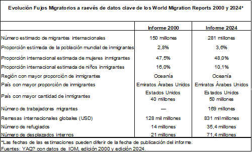 El primer Informe sobre las Migraciones en el Mundo hecho por la Organización Internacional para las Migraciones se publicó hace 24 años, inicialmente como un informe único diseñado para mejorar la comprensión de la migración por parte de los responsables políticos y el público en general. Se concibió en un momento en que los efectos de la globalización se sentían en muchas partes del mundo y de múltiples maneras.