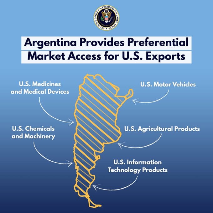 La cuenta del USTR refleja una euforia bien detallada: “Desde medicamentos y vehículos motorizados hasta maquinaria y productos agrícolas, el acuerdo con Argentina negociado por Estados Unidos asegura un acceso significativo al mercado para las exportaciones agrícolas e industriales de los Estados Unidos. Y el mapita de la Argentina que incluye el posteo, por su puesto sin las Malvinas, tiene un título acorde al plan: “La Argentina provee acceso preferencial a su mercado a las exportaciones de los Estados Unidos”.